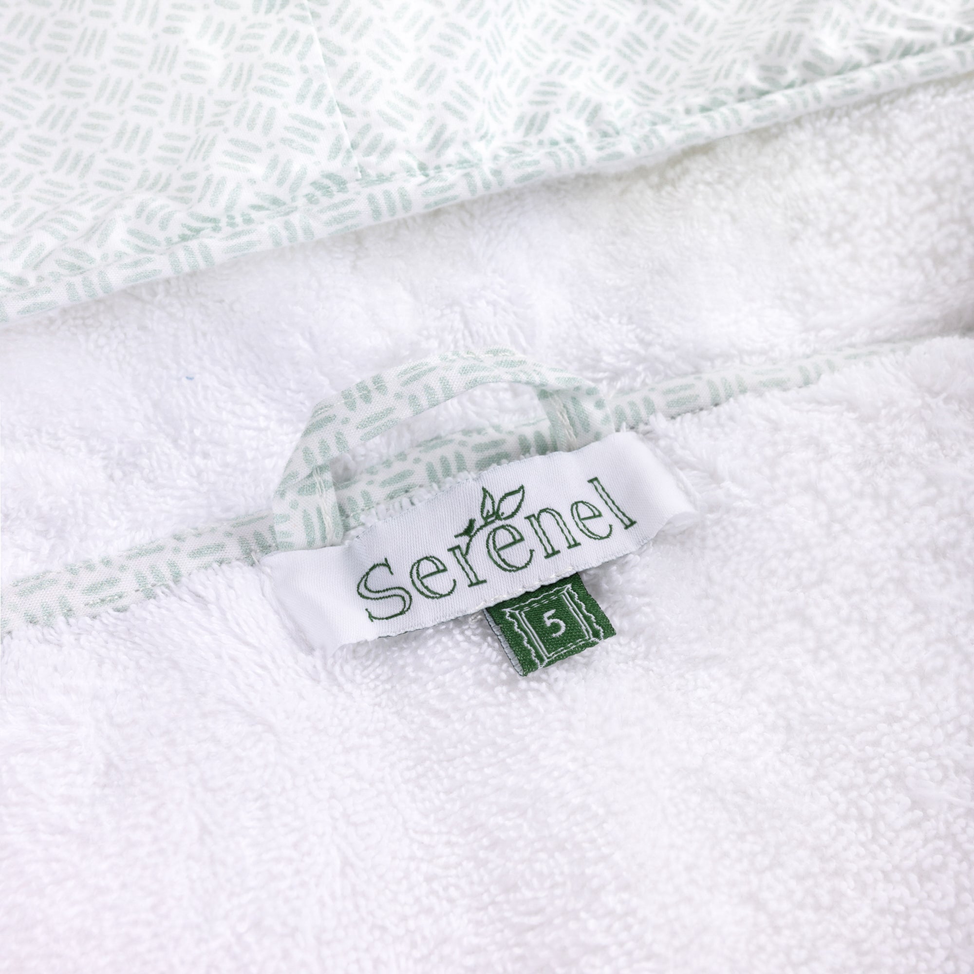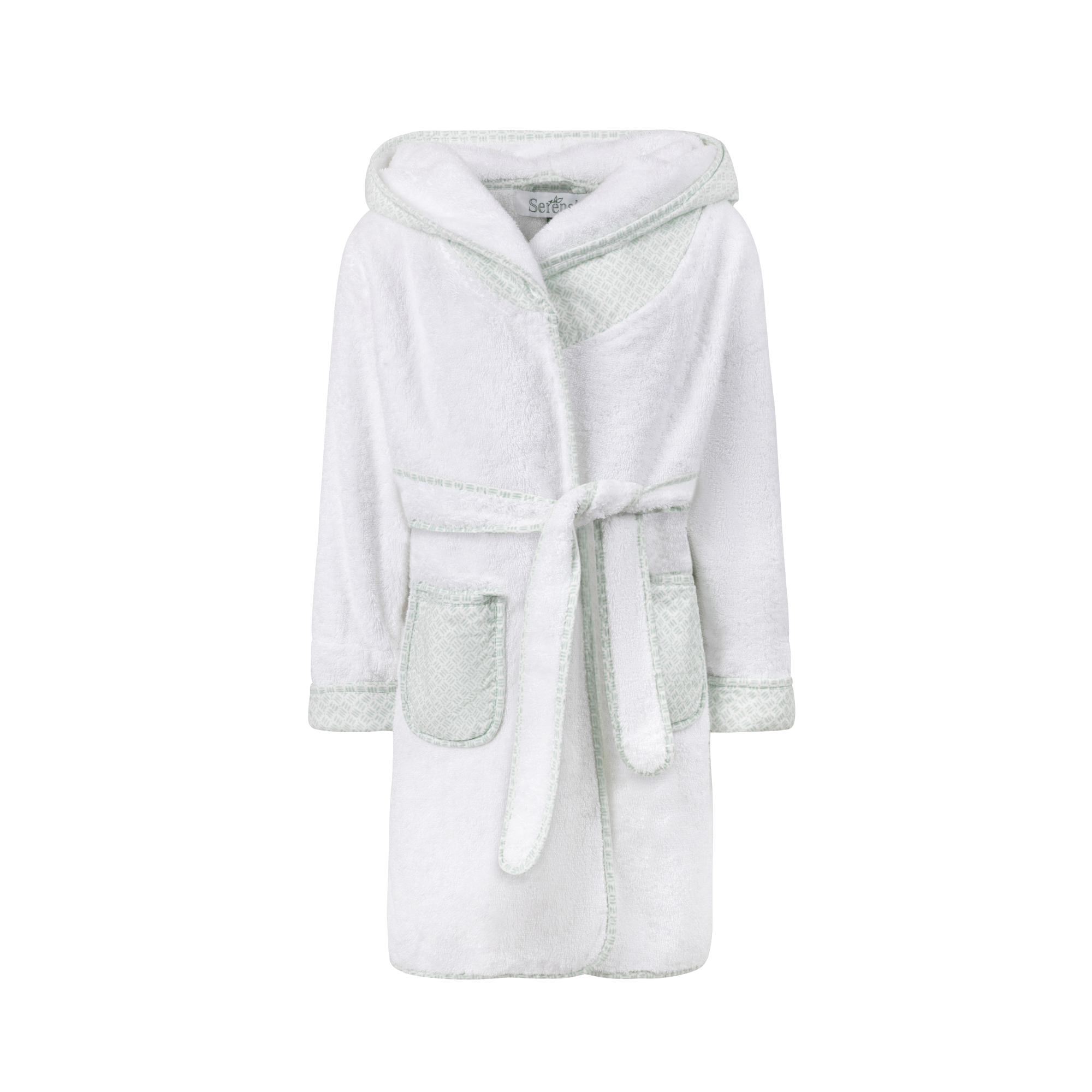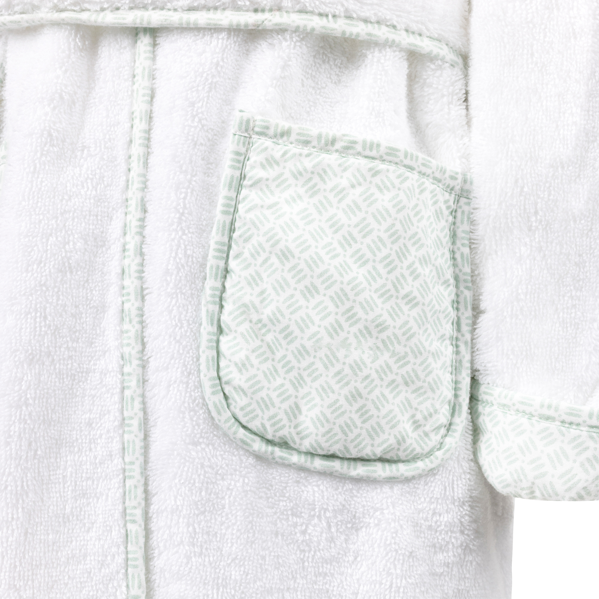 Soft and absorbent, this 100% cotton robe features a soft sage geo print hood and trim for a fresh, calming look. Thoughtfully designed with a sewn-on belt, handy pockets, and an inner snap for a secure, comfy fit.