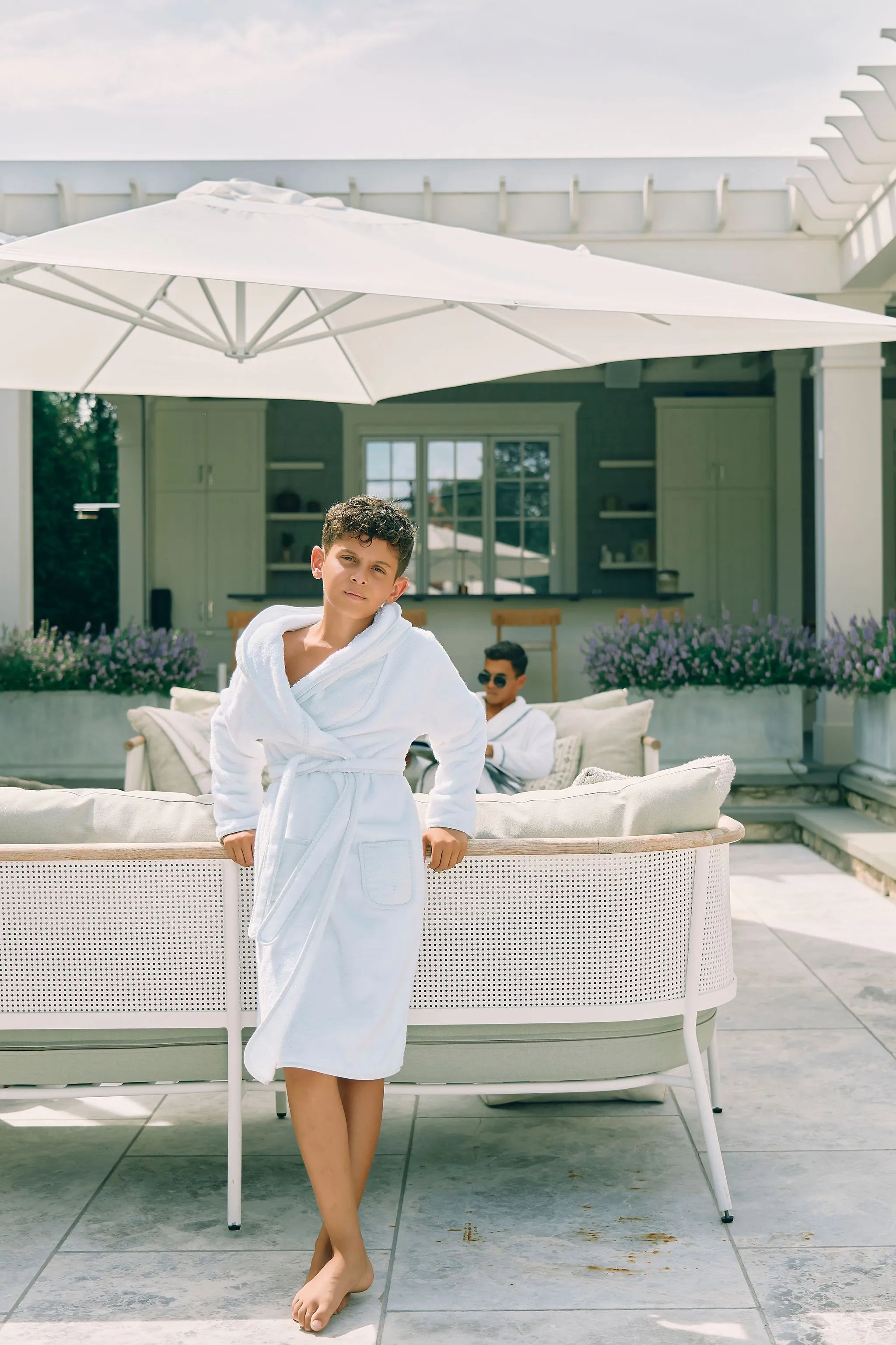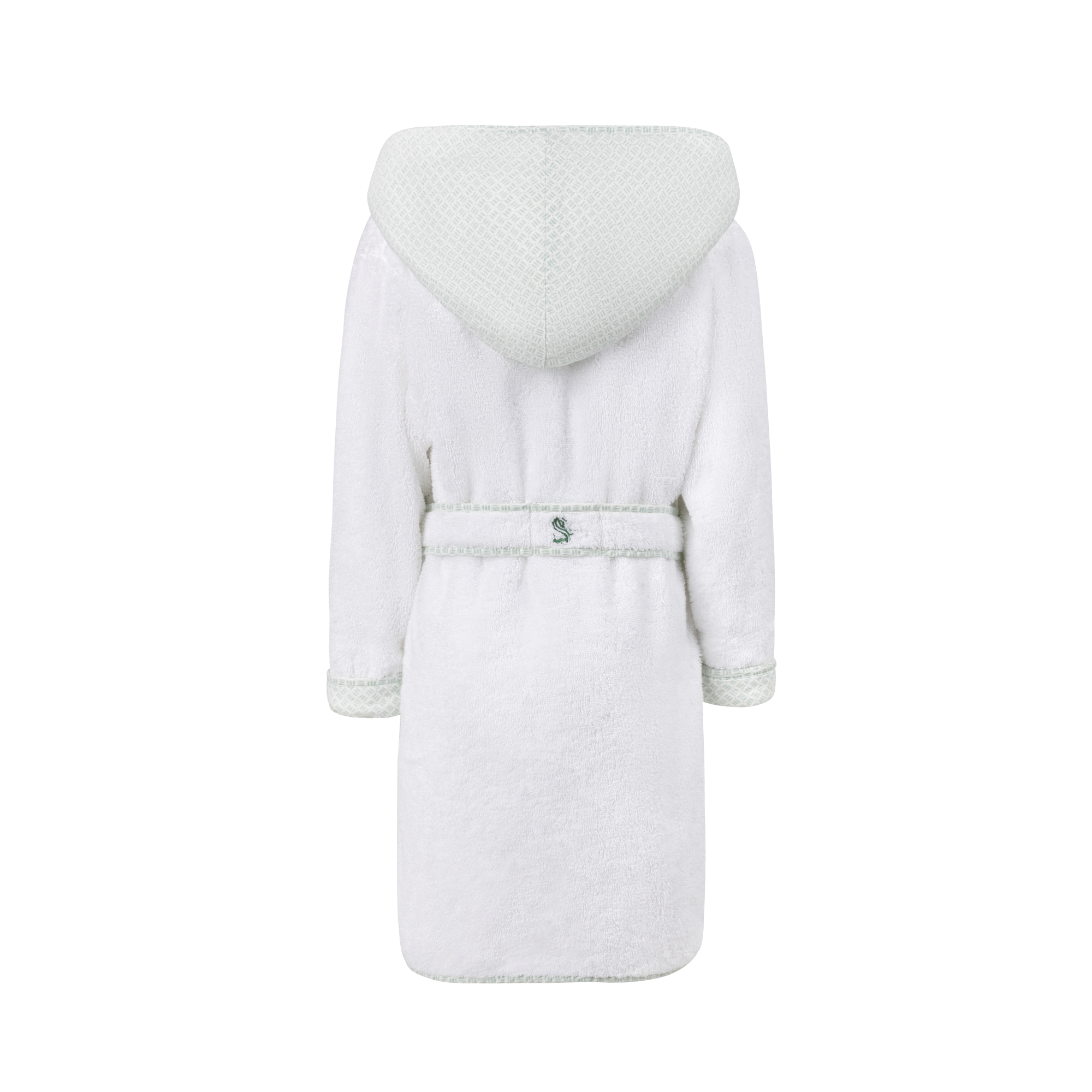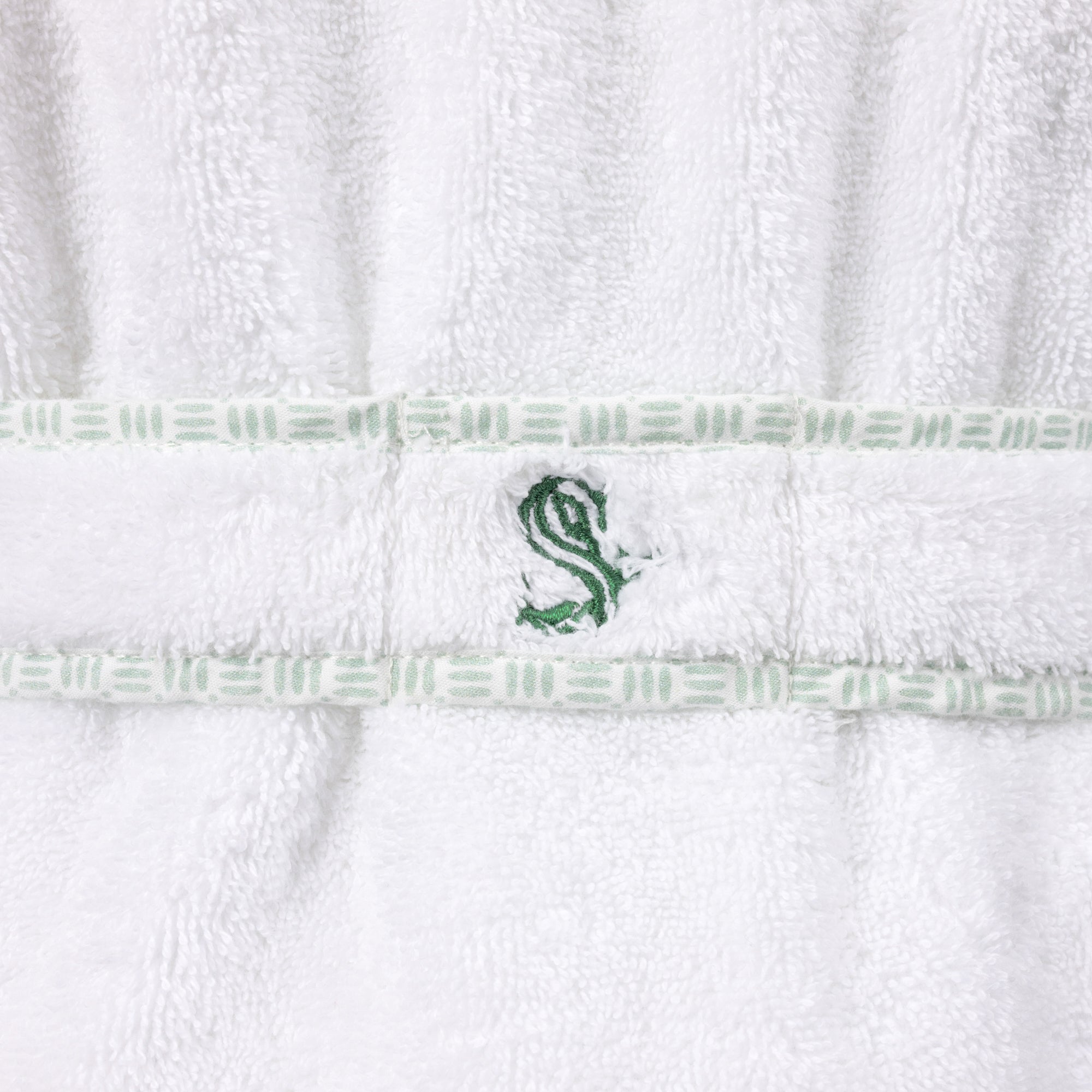 Soft and absorbent, this 100% cotton robe features a soft sage geo print hood and trim for a fresh, calming look. Thoughtfully designed with a sewn-on belt, handy pockets, and an inner snap for a secure, comfy fit.