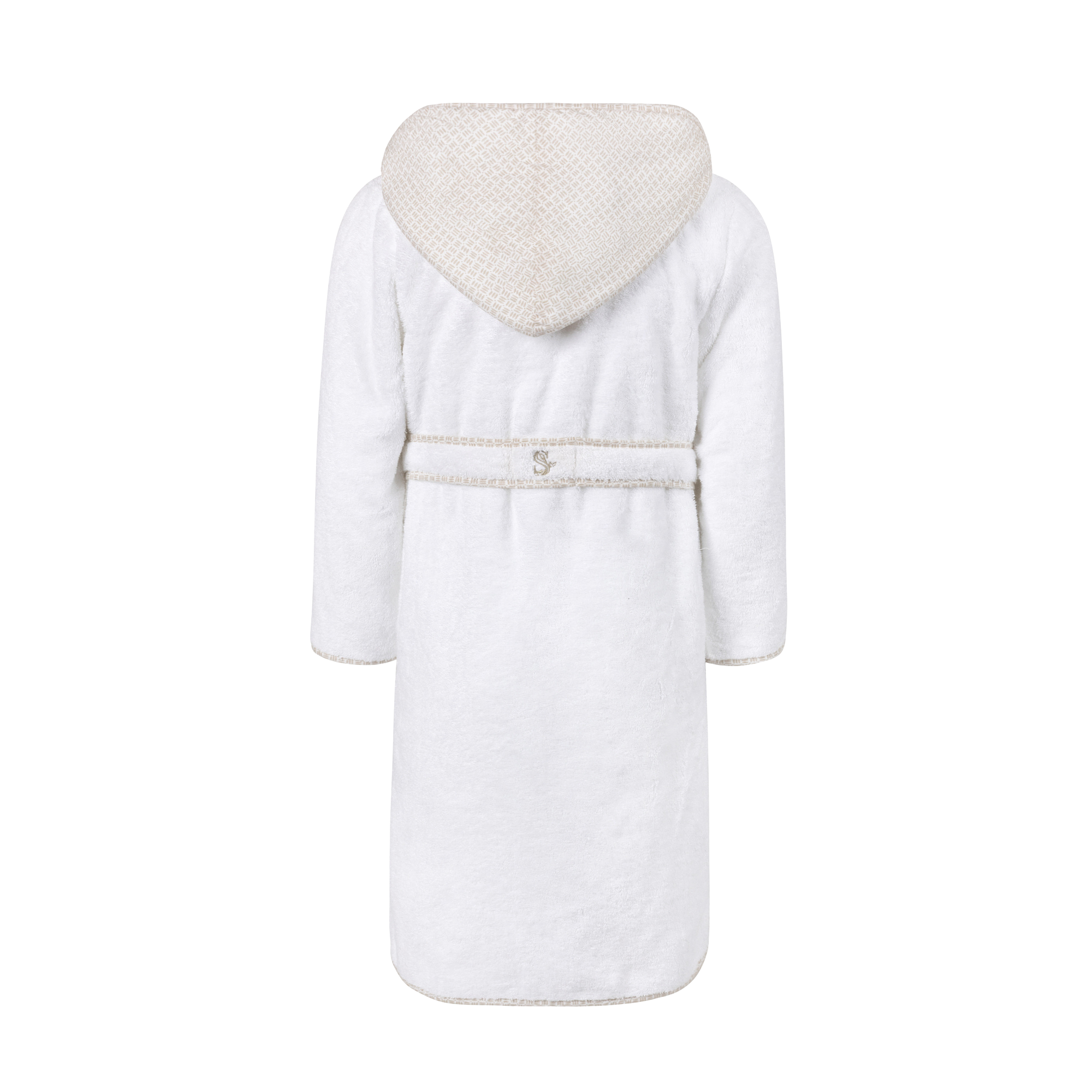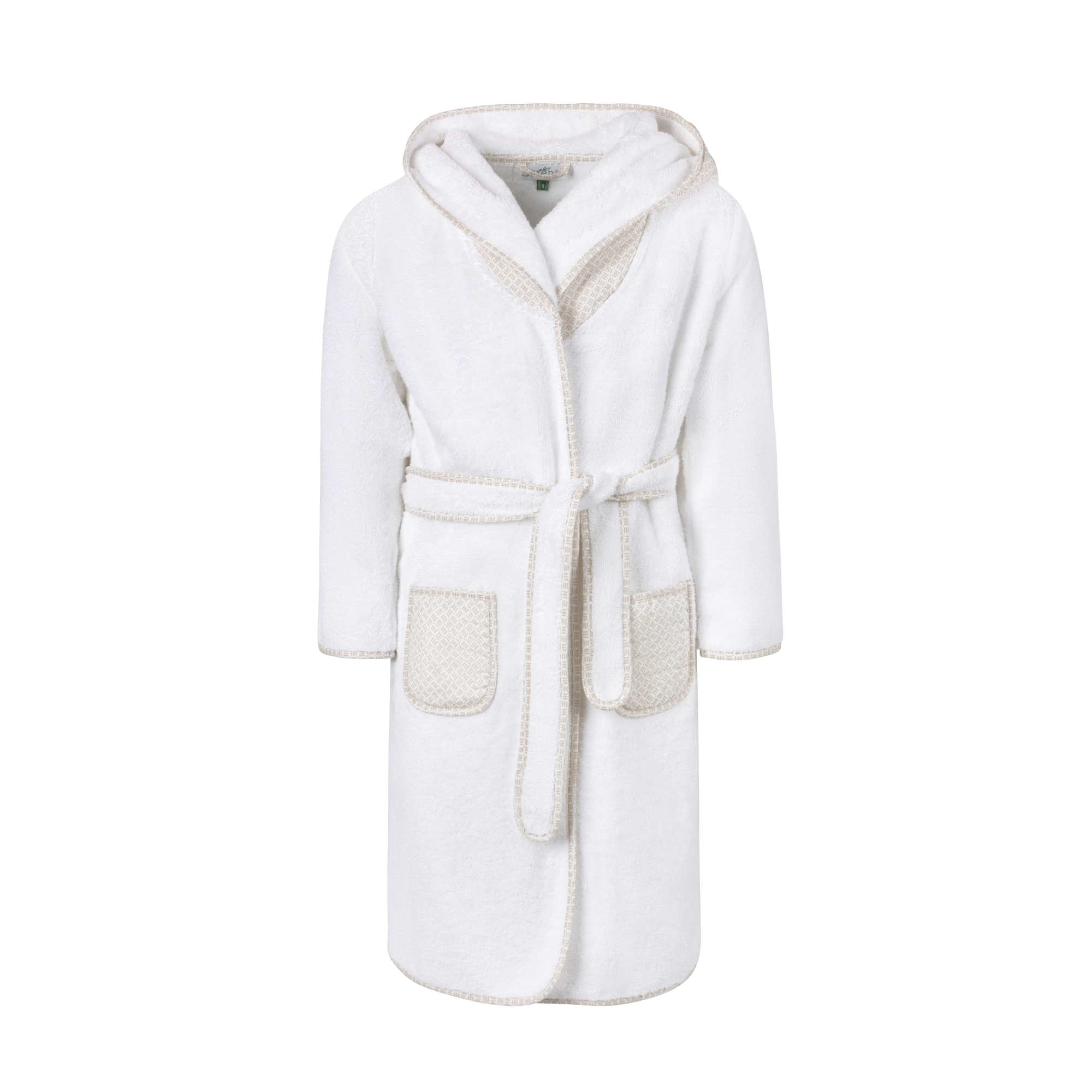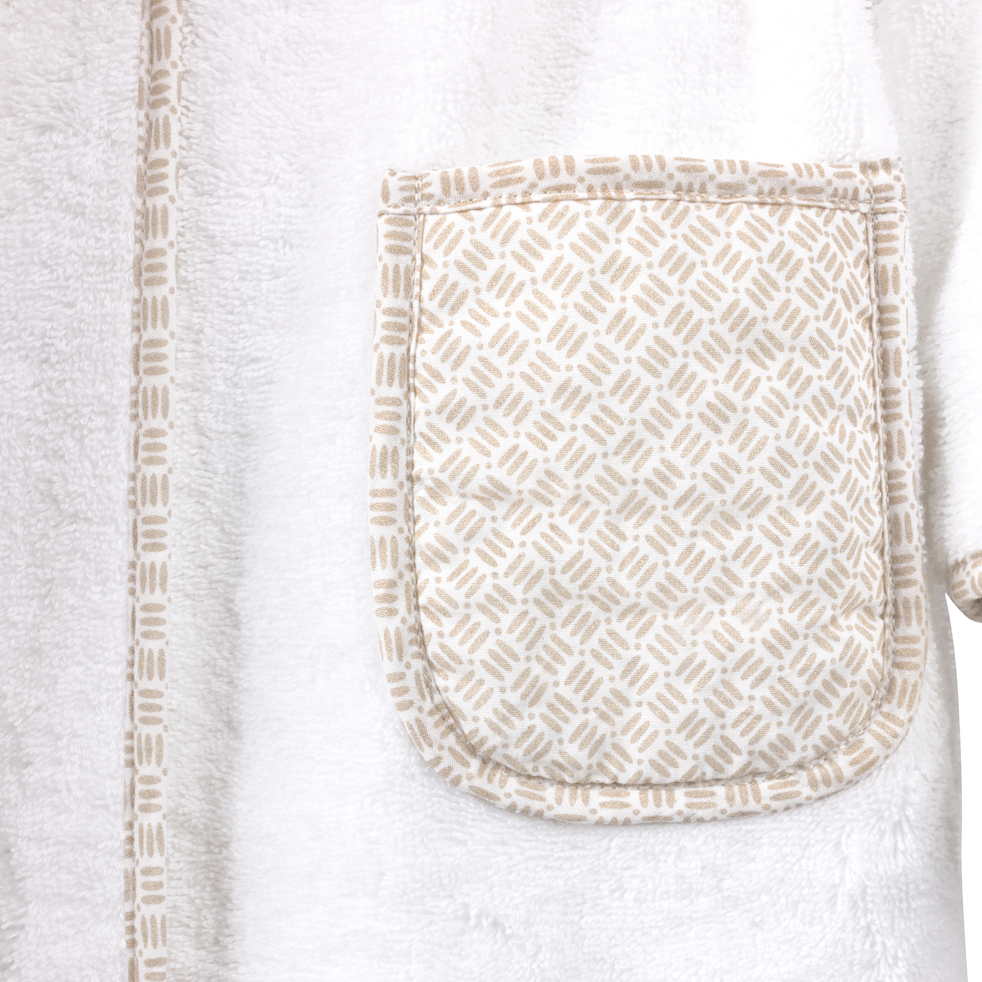 Soft and absorbent, this 100% cotton robe features a taupe geo print hood and trim for a clean, gender-neutral look. Thoughtfully designed with a sewn-on belt, handy pockets, and an inner snap for a secure, comfy fit.