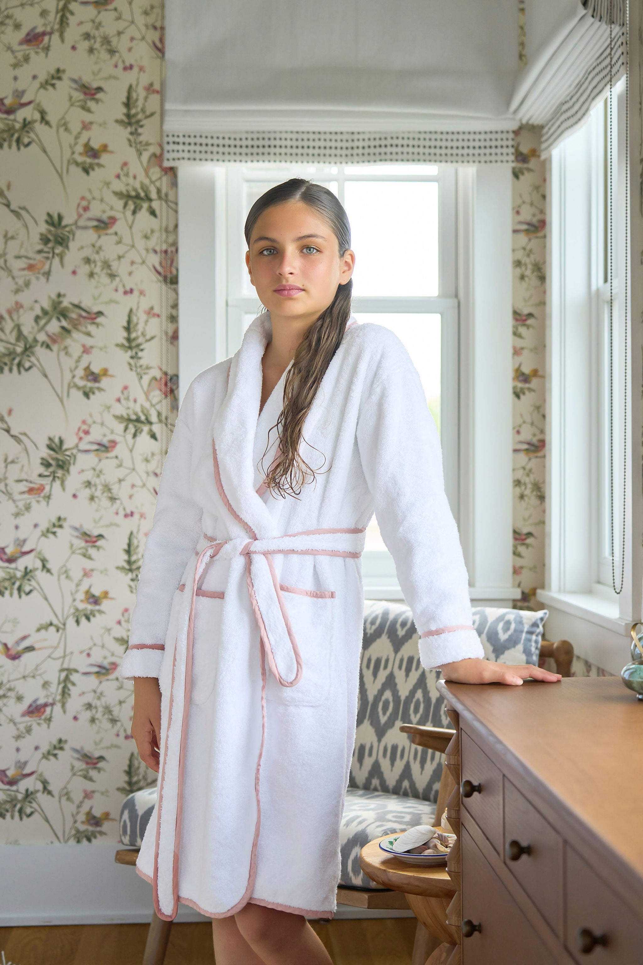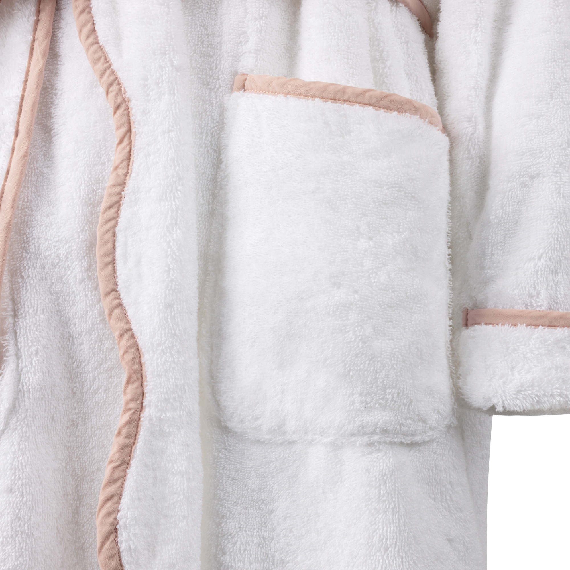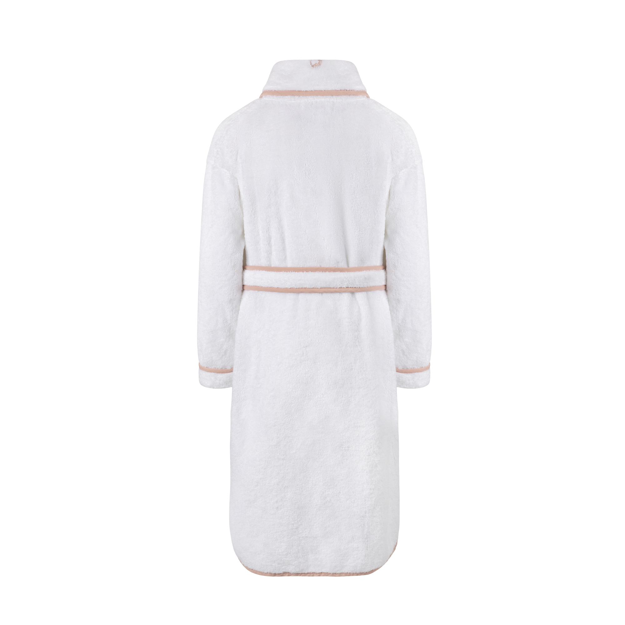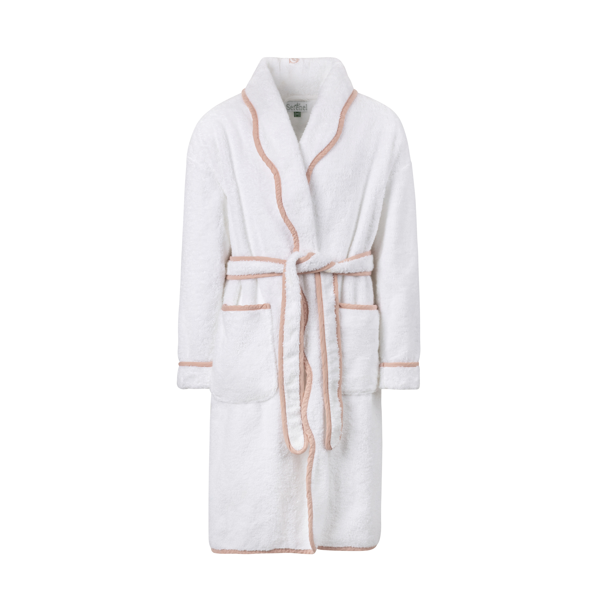 Made from soft, absorbents 100% cotton, this robe is finished with a refined mauve scalloped trim for a feminine, elevated look. A sewn-on belt, inner snap, and front pockets keep the fit secure and effortless.